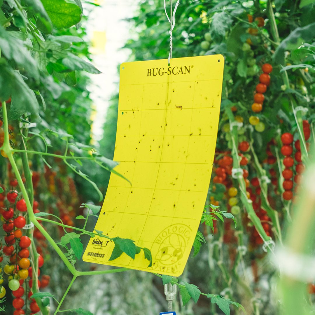 Some of the bad bug traps we use in our greenhouses include sticky cards and sticky tape. Vibrant sticky card traps are hung throughout the greenhouse to attract bad bugs. Once a bad bug lands on the surface of the card, they stick to it and can’t escape. We use yellow, blue, and white sticky cards as different bad bugs are attracted to different colors.