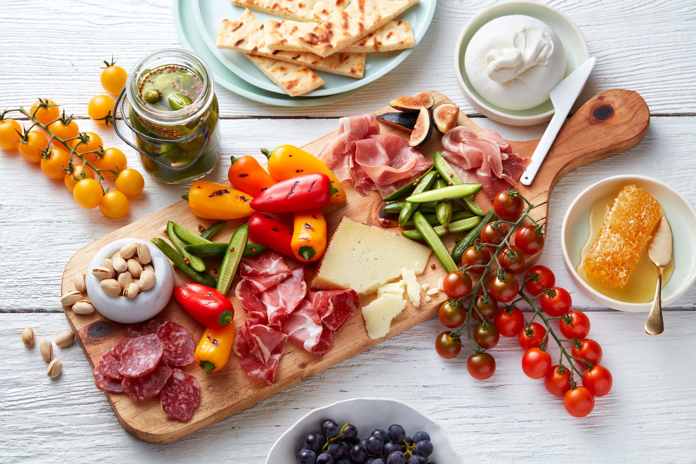 Customize and have fun with your grazing board, choosing any favorite cured meats and cheese for a personalized touch. Grill the peppers and leave tomatoes on the vine for more creative touches.