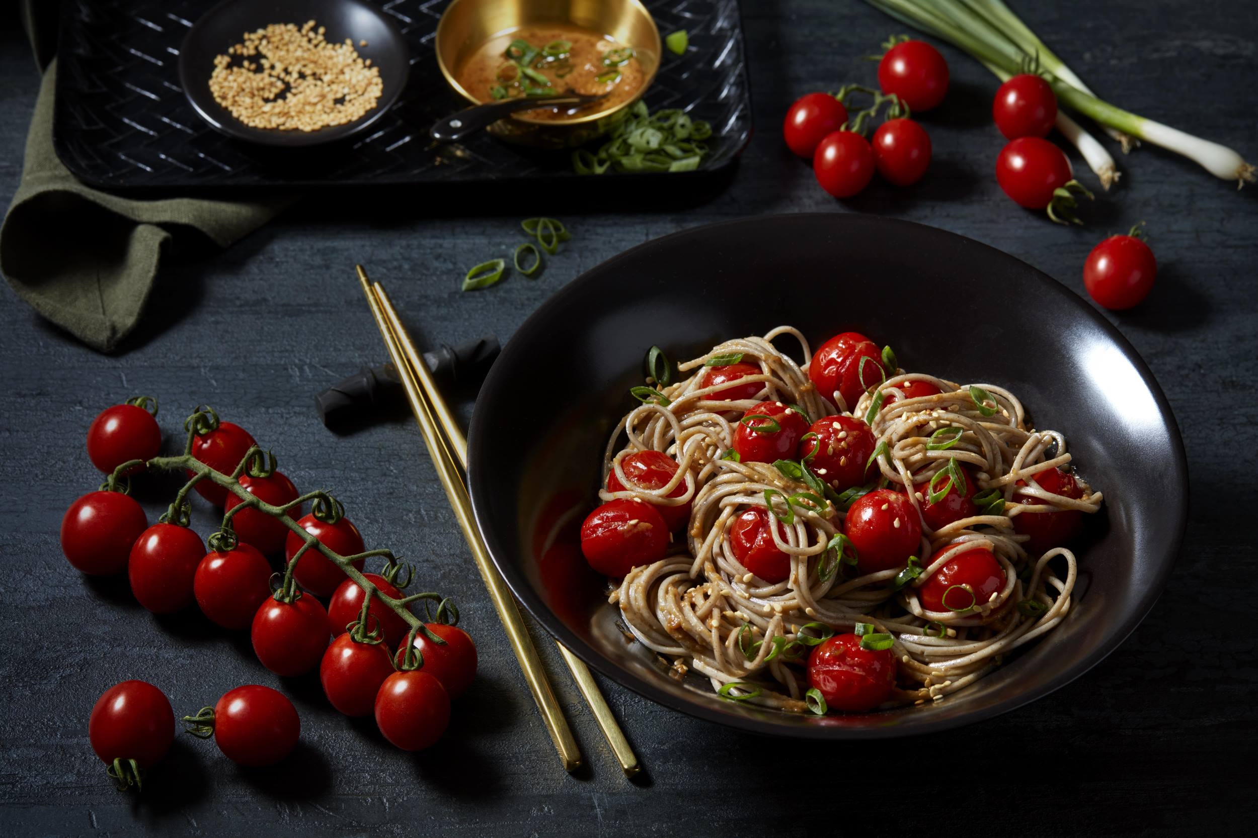 Toss noodles with remaining dressing in large bowl; pour in roasted Tomatoes and their juices. Add green onions, tossing well. Divide among bowls and top with sesame seeds.